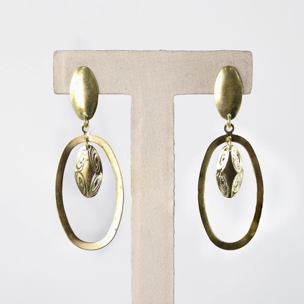 Brinco Oval Vazado e Dois Pêndulos - Ideal para revenda, este brinco é uma peça bruta que vai encantar seus clientes! Com um design moderno e leveza que proporciona conforto, o brinco pesa aproximadamente 3,8 g e é confeccionado em latão para banho, garantindo durabilidade e qualidade.