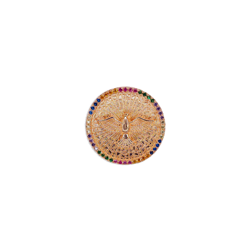 Quer um item exclusivo para revenda que vai conquistar seus clientes? o pingente medalha concova do espírito santo cravejado importado é a escolha perfeita! Com acabamento de joalheria, feita de latão para banho, garantindo qualidade e durabilidade. Leve e estilosa, Não perca a chance de adicionar esse produto incrível ao seu estoque!