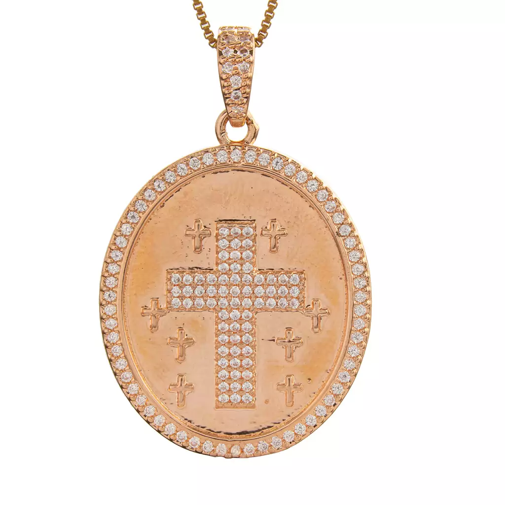 Quer um item exclusivo para revenda que vai conquistar seus clientes? o pingente medio oval cruz centro micro zircônia bordas com micro zircônias cravejada é a escolha perfeita! Com acabamento de joalheria, feita de latão para banho, garantindo qualidade e durabilidade. Leve e estilosa, Não perca a chance de adicionar esse produto incrível ao seu estoque!