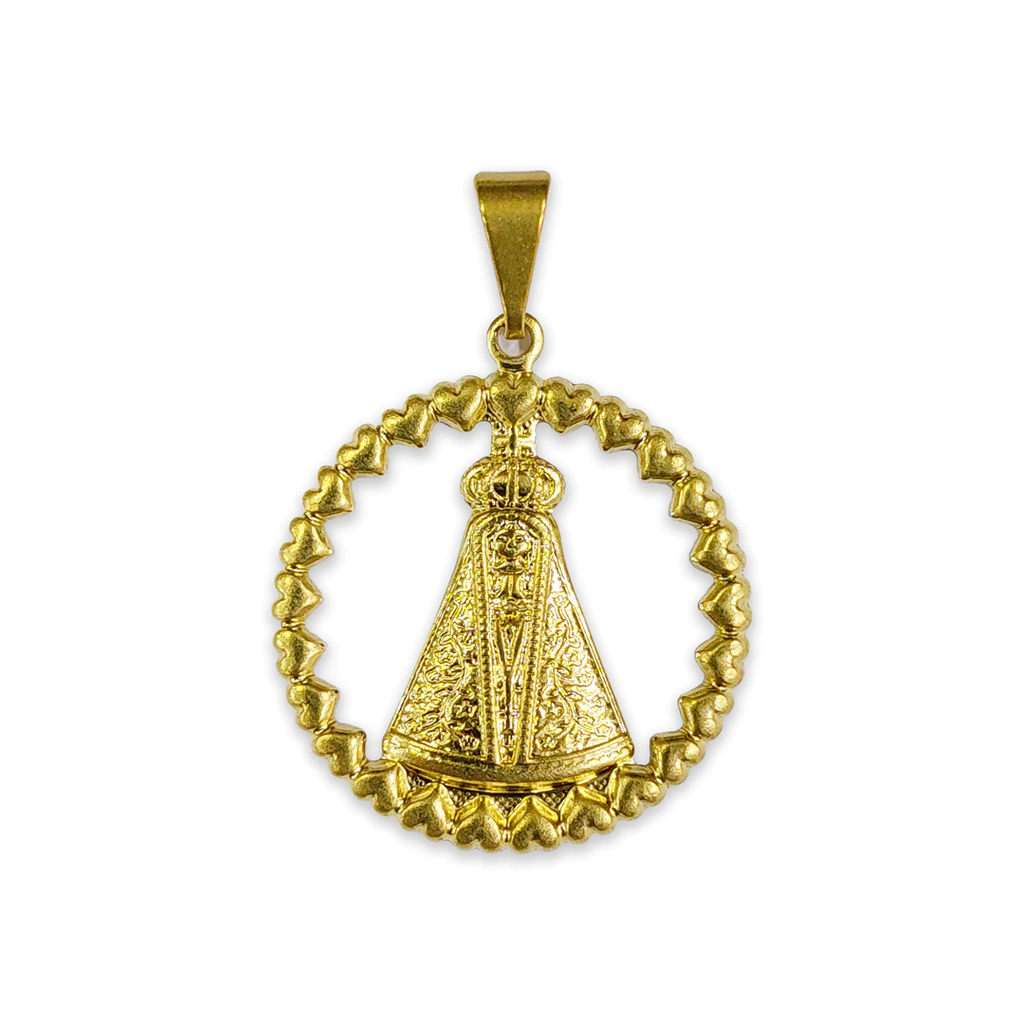 Quer um item exclusivo para revenda que vai conquistar seus clientes? o pingente nossa senhora aro de coração é a escolha perfeita! Com acabamento de joalheria, feita de latão para banho, garantindo qualidade e durabilidade. Leve e estilosa, Não perca a chance de adicionar esse produto incrível ao seu estoque!