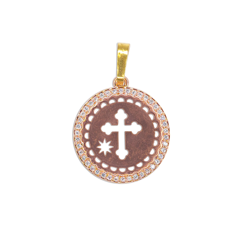 Quer um item exclusivo para revenda que vai conquistar seus clientes? o pingente placa cruz redonda cravejado é a escolha perfeita! Com acabamento de joalheria, feita de latão para banho, garantindo qualidade e durabilidade. Leve e estilosa, Não perca a chance de adicionar esse produto incrível ao seu estoque!
